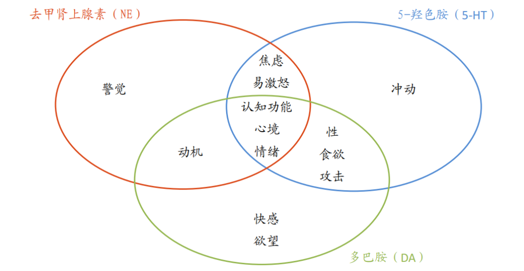 基于MAOI 药物的成功,“单胺假说”于1965年被首次提出,它将人之所以会抑郁归结为脑中单胺递质功能不足所致,也就是去甲肾上腺素(NE)、5-羟色胺(5-HT)、多巴胺(DA)三种单胺递质密度水平较低。