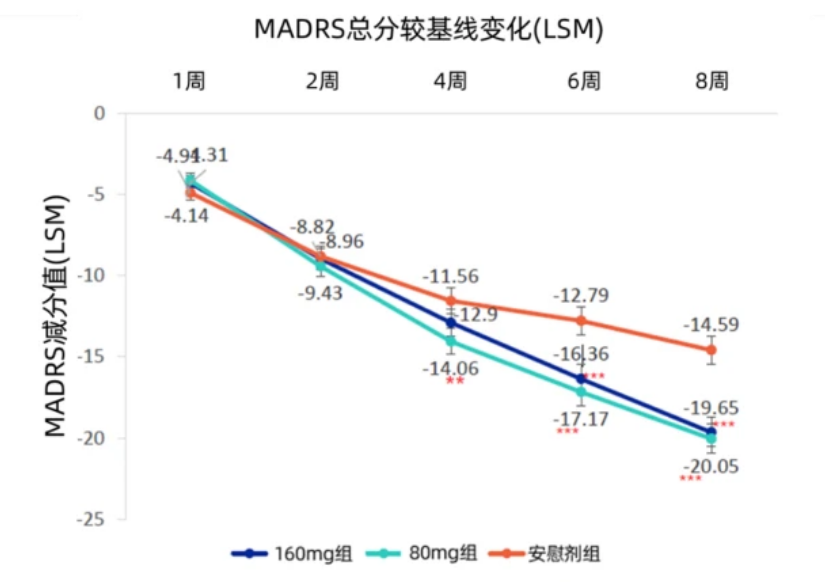 从绿叶制药公布的III期临床研究结果看,若欣林治疗组较对照组表现出优异的数据,抑郁量表(MADRS)总分较基线变化明显优于对照组。安全性方面,若欣林治疗组同样反应优秀,不良反应多为轻、中度,较少导致治疗终止,且无药物相关的严重不良事件发生。