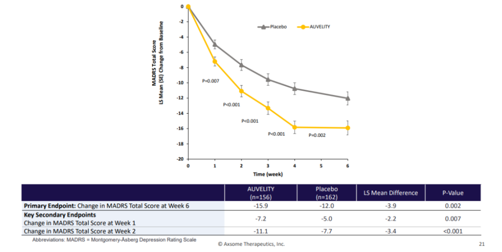 上市之前,Auvelity曾做过包含1100余名抑郁症患者的III期临床试验,Auvelity治疗组的患者MADRS量较对照组下降明显,也并未出现明显的不良反应症状。尤其值得注意的是,Auvelity治疗组患者的MADRS评分在第1周就有了明显改善,而若欣林在第1周的表现却并不明显。