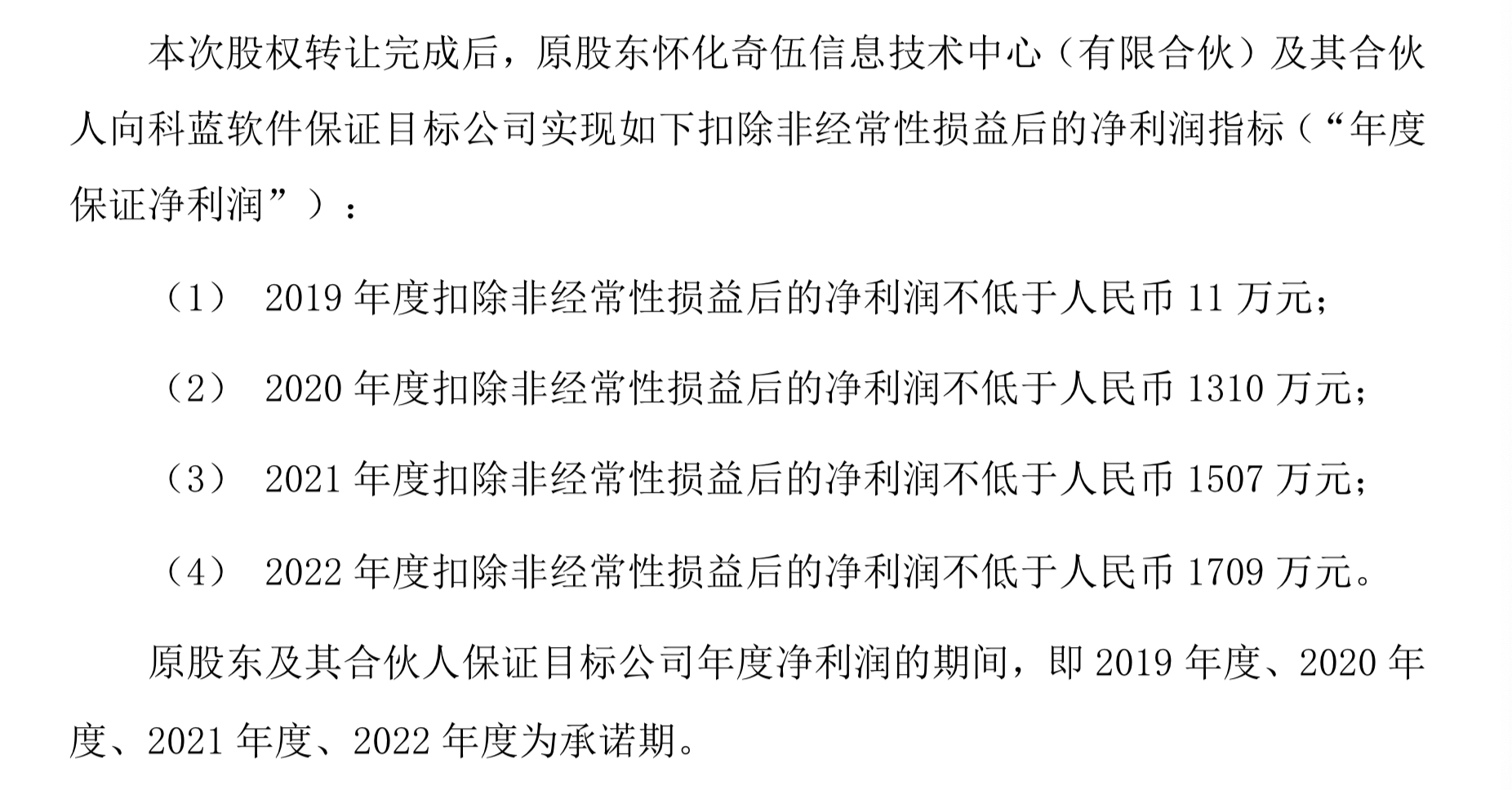 2020年收购宁泽金融51%股权时,宁泽金融原股东承诺2020年、2021年度扣非净利润分别不低于1310万元、1507万元。