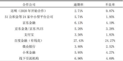 2020年中邮消金中介引流机构贷款逾期率和不良率统计