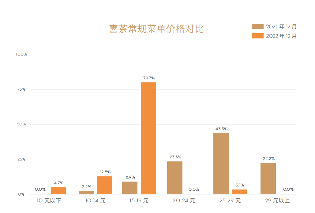 而在爆款新品背后,是喜茶产品价格带与研发方向的全面迁移。喜茶产品开始注重性价比,去年喜茶的主力新品分别是多肉桃李、多肉车厘莓、多肉杏运桃、酷黑提莓、糯糯系列等,新品几乎无一例外地选择了15到19元价格带。喜茶数据显示,这一主力价格带截至去年12月的产品占比还是8.9%,今年12月已经占到79.7%。