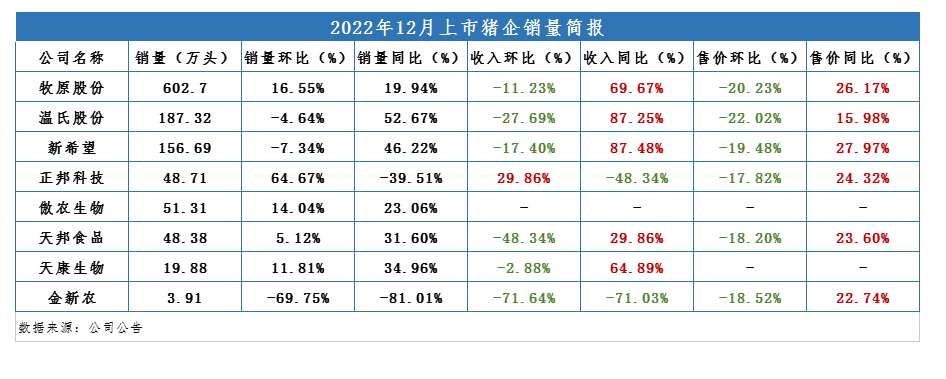 受到猪肉价格持续下降影响,近期主要上市猪企披露的2022年12月销售数据,销售收入环比普遍下降,而相较于2021年同期则仍保持较大幅度的增长(如下图)。