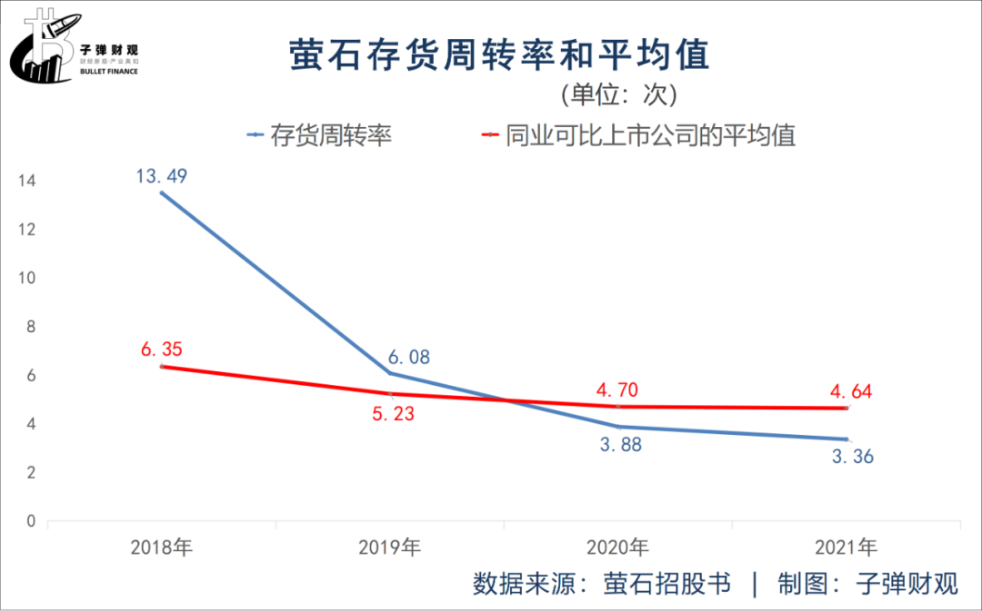 而且,从2020年起,萤石的存货周转率已下滑至同业可比上市公司的平均值以下。