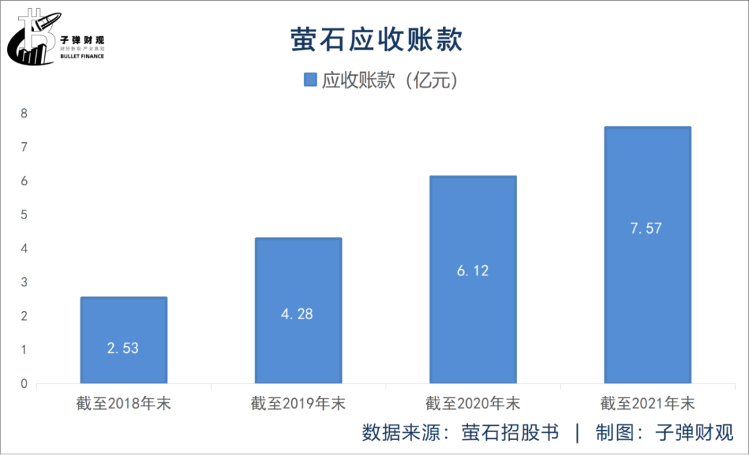 除了资产负债率偏高以外,萤石也面临应收账款激增的风险。招股书显示,截至2018年末,萤石的应收账款仅为2.53亿元,而截至2021年末,这一数值已飙升至7.57亿元。