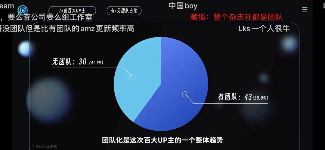 B站UP主“影视飓风”在百大颁奖前后采访了70位百大UP主,发现其中有近30位UP主是无团队在个人创作内容,甚至还有近三成UP主是直接使用手机创作。这对于中小投入的创作者来说,B站依然是存在机会的平台。