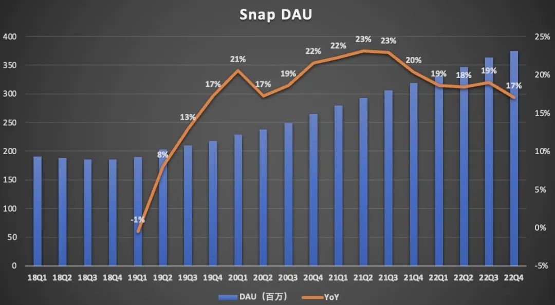 用户是社交平台的重要衡量指标。Snap每日活跃用户同比增速也在放缓。财报显示,Snapchat第四季度日活用户(DAU)为3.75亿,同比增长17%,低于上一季度19%的同比增速,以及上年同期20%的同比增速。