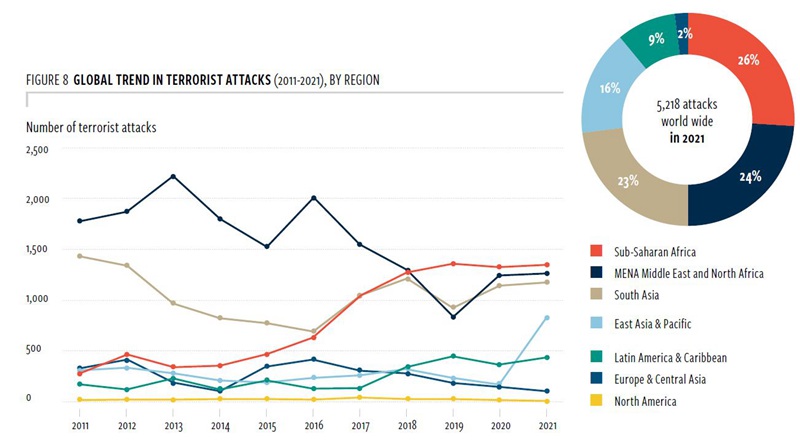 在其他地区恐袭减少之时,撒哈拉以南非洲的恐袭数量却在上升。2021年,即便有新冠疫情影响,撒哈拉以南非洲依然成为全球唯一一个恐袭形势恶化的地区。
