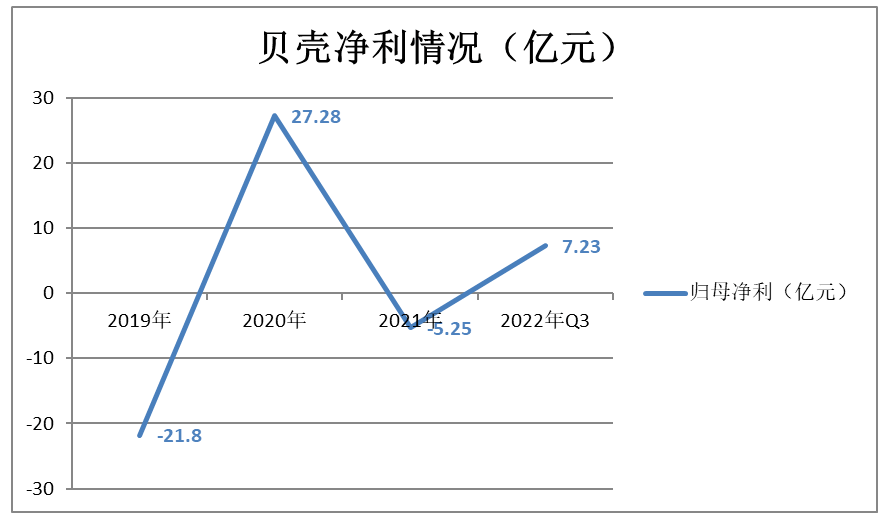 就业绩来看,2019年-2021年,贝壳净利润分别为-21.8亿、27.78亿和-5.25亿元,经历由亏转盈再转亏的过程,2022年三季度,贝壳又扭亏为盈,当季净利润达到7.16亿元,似乎暂未踏上稳定盈利的道路。