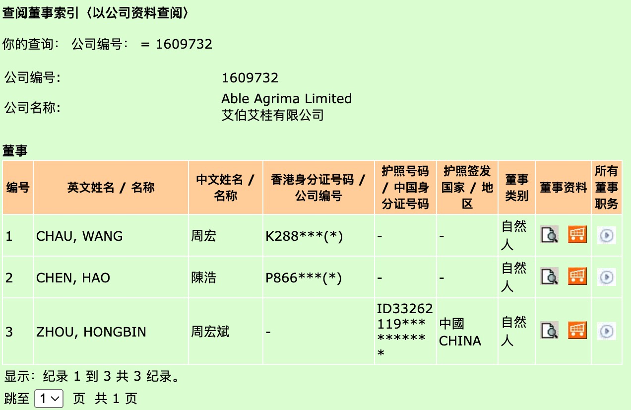 2月20日,界面新闻通过“公司註冊處綜合資訊系統 (ICRIS) 的網上查冊中心”查询到,艾伯艾桂目前董事为周宏、陈浩、周宏斌。通过进一步查询发现,周宏斌于2018年9月26日委任为艾伯艾桂董事。