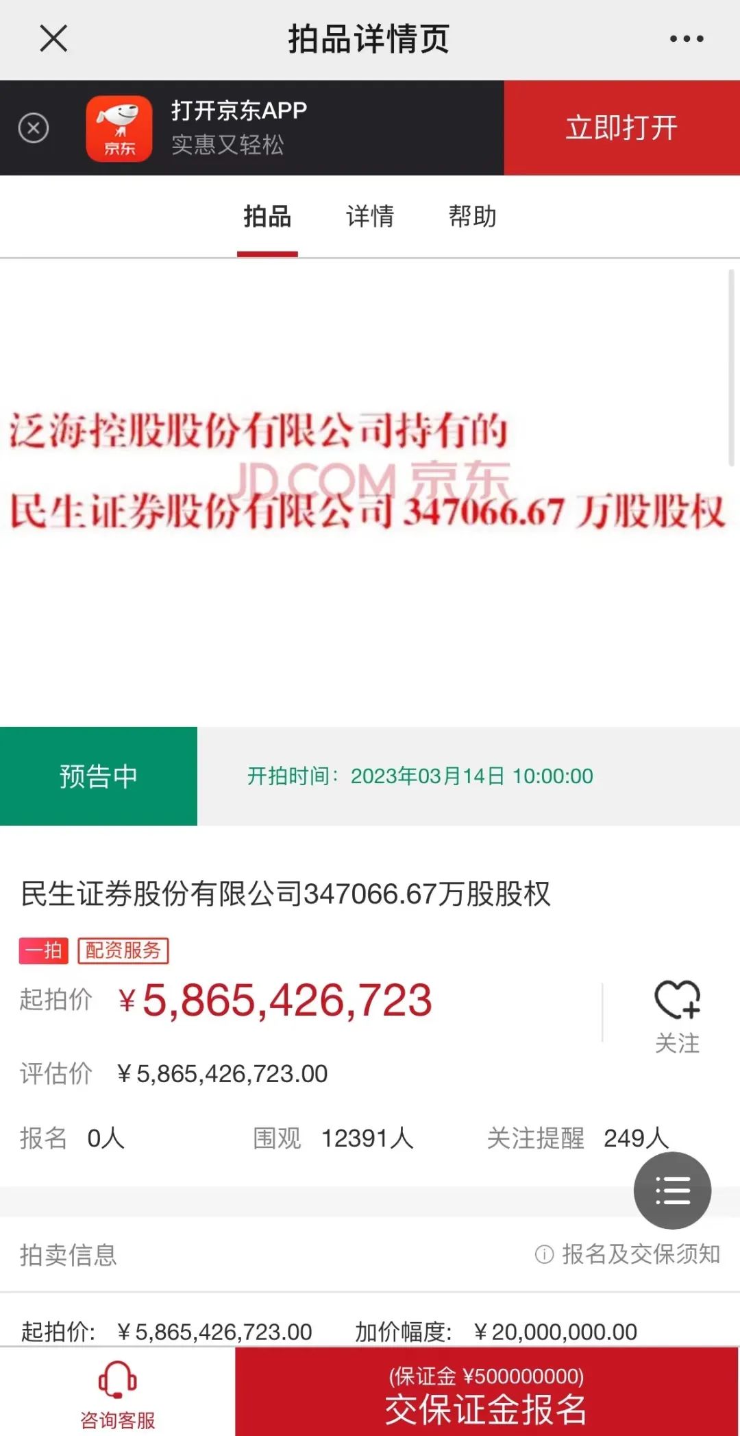 根据京东网络司法拍卖平台信息显示,泛海控股(000046.SZ)所持有的民生证券35亿股权将于3月14日公开拍卖,拍卖者为山东高速(600350.SH),起拍价58.65亿元,折合每股约1.69元,PB(市净率)为1.25倍。