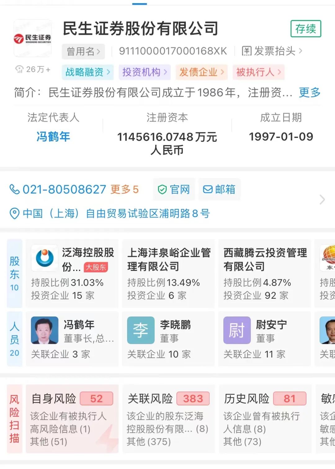 民生证券一直是泛海的优质资产,其前身是河南地方券商黄河证券,2002年前后,“泛海系”出资2.4亿元增资扩股成为第一大股东,后更名为民生证券。
