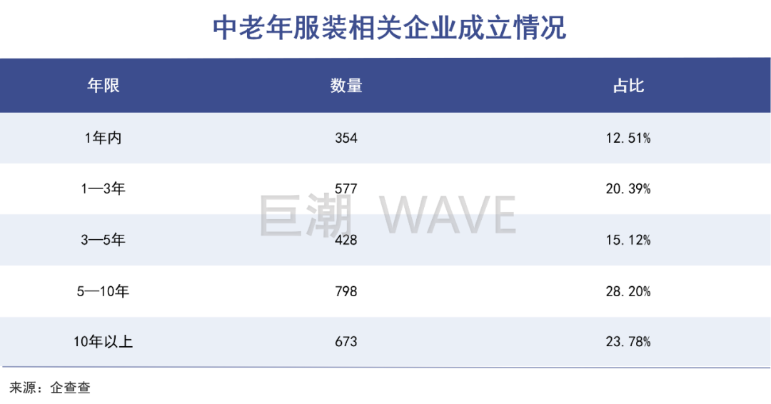 也就是说,有将近一半的中老年服装相关企业,都是刚刚入场“掘金”。