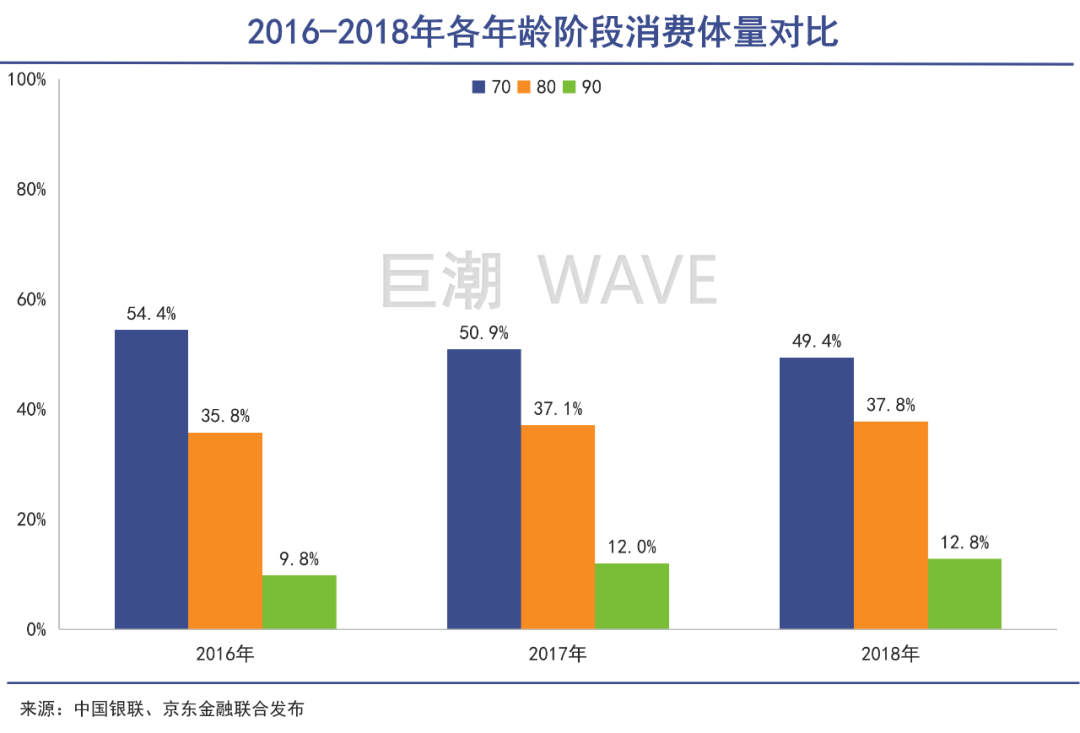 在疫情之前的2019年,根据中国银联&京东金融联合发布的报告显示,2016-2018三年期间各年龄阶段消费体量的对比,70后连续三年以54.4%、50.9%、49.4%的占比,始终是各年龄阶段消费体量最高的群体。
