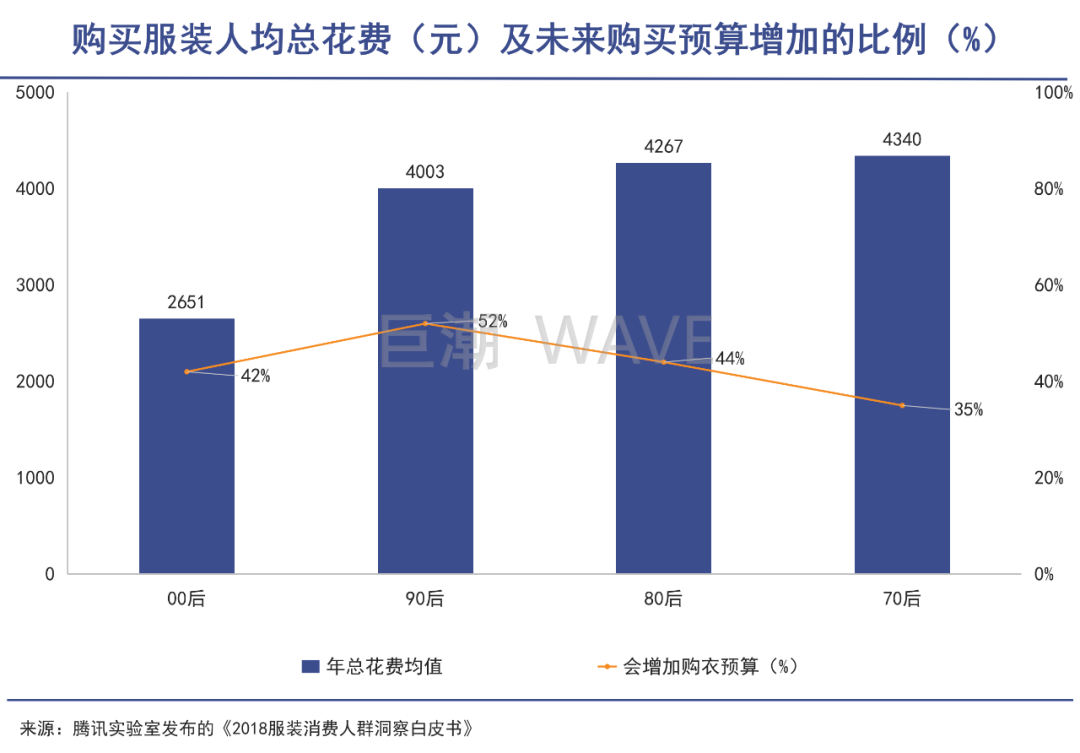 根据腾讯实验室发布的《2018服装消费人群洞察白皮书》显示,国内年人均服饰消费近4000元,在服饰消费各年龄阶段对比中,70后人群消费最多,人均平均消费高达4340元。