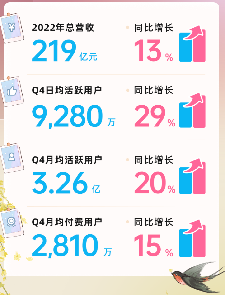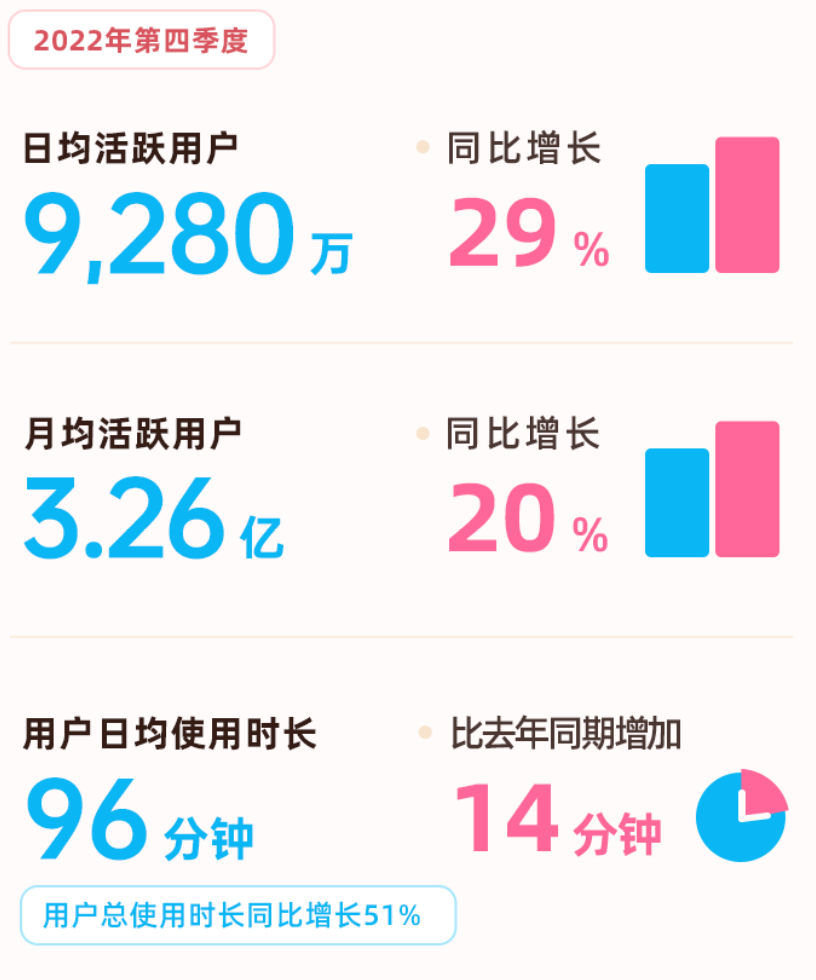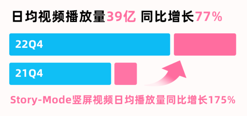 财报数据显示,2022年第四季度,在社区内容整体日均播放量同比增长77%的前提下, 2022年第四季度Story-Mode竖屏视频日均播放量同比增长175%。且在平台广告业务逆势增长的过程中,第四季度效果类广告收入同比增长超50%,这其中同样离不开Story-Mode竖屏视频所构建的新广告场景。