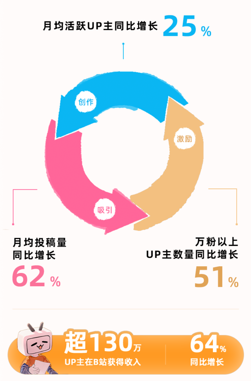 反映到财报数据上,这一思路确实刺激了更多UP主的创作欲望。2022年第四季度,B站月均活跃UP主同比增长25%,月均投稿量和万粉以上的UP主数量分别实现62%和51%的同比增长。在这之中,超130万UP主在B站获得收入,同比增长64%。