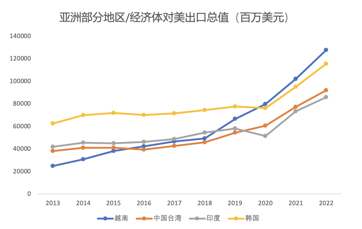 过去十年之内,越南的对美出口从2013年的246.51亿美元增长近五倍至1275.21亿美元,韩国的对美出口总值同样从623.7亿美元增长至1153.4亿美元。去年挤入全球经济规模第五位的印度对美出口总值则从418亿美元增长至856.7亿美元。