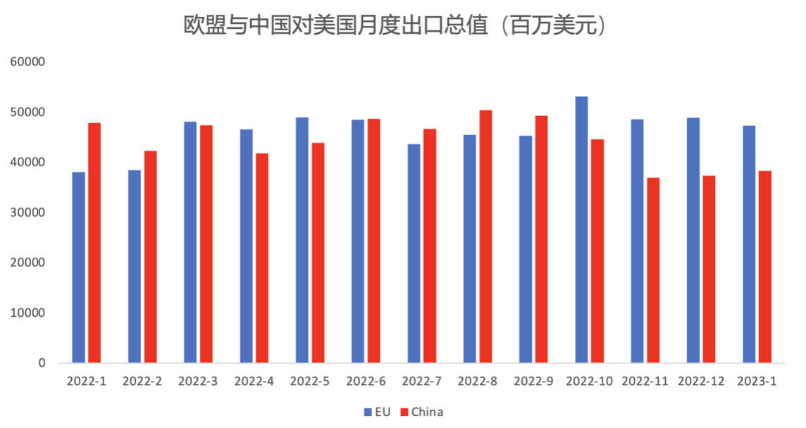 事实上,2022年所有月度的美欧之间贸易额均录得了同比增长,全年进出口总值同比增长18.4%至9025亿美元。这也意味着美欧两大经济体挤掉中国互为第一大贸易伙伴。