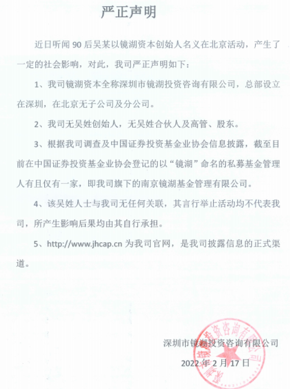公告义正言辞地划清界限,声称镜湖资本既没有在北京的分公司,也没有什么吴姓创始人。