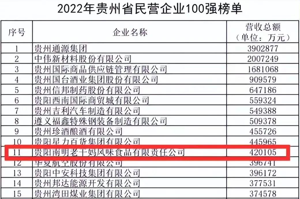 然而,今时不同往日的是,老干妈正逐渐滑落神坛。一切其实早有端倪,前段时间《2022贵州民营企业100强》榜单发布,老干妈以42.01亿元的营收额,从第六跌出前十,仅列第11名,营收直接下滑12亿元,退步如此之多,震惊了酱料赛道。