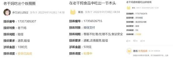 雪上加霜的是,曾以“零缺陷”通过美国FDA食品安全检查的老干妈,如今却屡遭质疑。在黑猫投诉平台上,可以看到不少吐槽:有过期仍在售卖的,有吃出小木块、铁圈圈甚至玻璃渣的,不胜枚举。