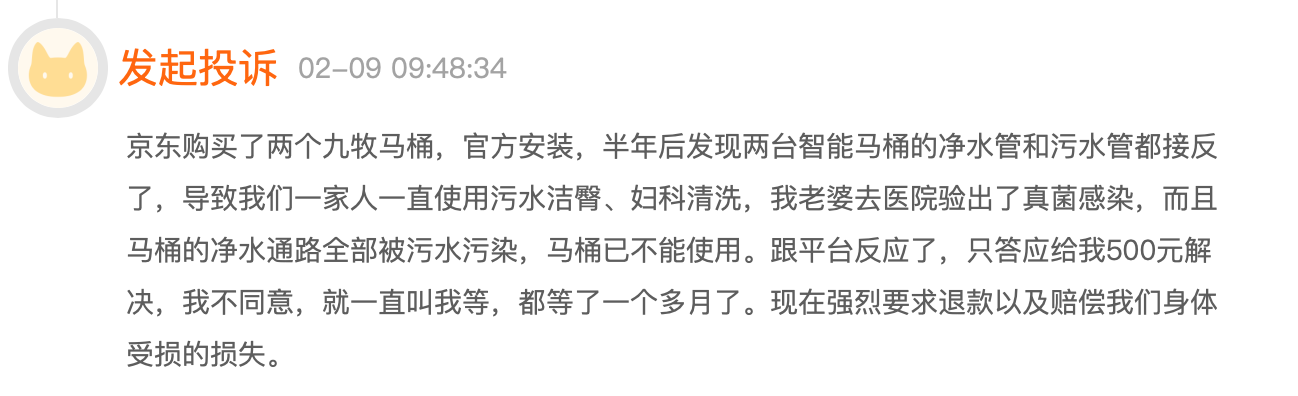 消费者赵先生投诉称,自己去年在京东花了6000多元购买了两个九牧智能马桶,并由官方人员安装:“然而过了半年之后才发现两台智能马桶的净水管和污水管都接反了。”赵先生表示,不仅由于净水马桶净水通路被污水污染,不能再使用了,家人还在医院检查出真菌感染,危害健康。
