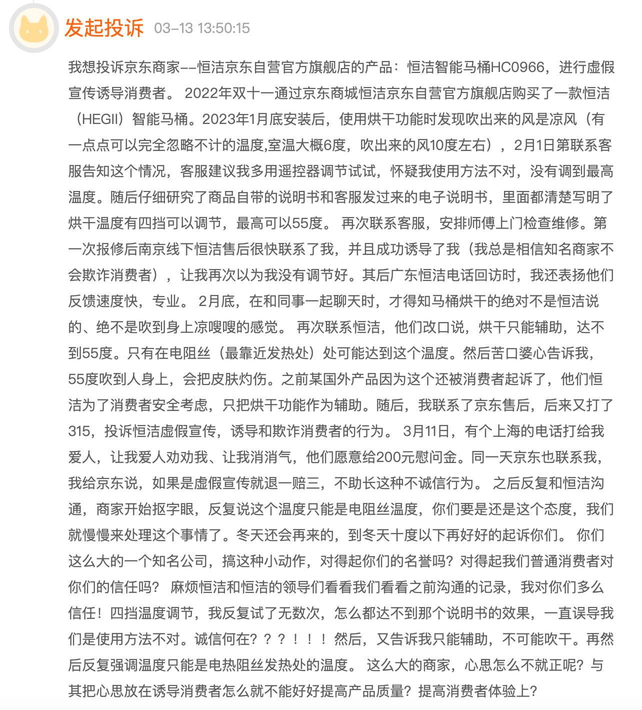 张女士表示,售后一度告知她凉风是为了避免烫伤,以及她操作不当的问题。直到张女士和同样买了恒洁智能马桶的朋友处了解到凉风并非产品正常表现,她才知道存在质量问题,而此时恒洁售后也有改口表现:“整个过程不仅是质量问题,也有虚假宣传,品牌不诚信的问题。”