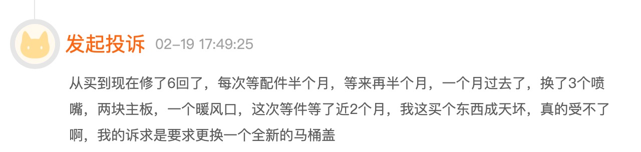 陈先生遭遇的质量问题则更加直接,他投诉称自己购买的箭牌智能卫浴马桶盖从购买之后到今年2月,已经陆续维修了6次,包括3个喷嘴、2块主板和1个暖风口、每次等配件到维修要1-2个月时间:“1300多元的马桶盖总是坏,真的受不了,诉求是要更换一个全新的马桶盖。”