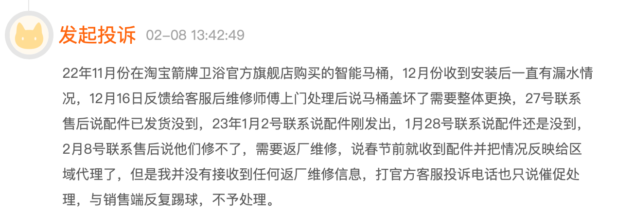“2022年11月在箭牌卫浴线上官方旗舰店购买的智能马桶,12月收到安装后持续有漏水情况。”消费者马女士花了2500多元购买,但安装后不到一个月就出现问题,期间安装师傅建议马女士进行整体更换,然而她在12月-2月间数次联系客服后,先后以配件未到、售后无法维修等理由,遭遇客服和销售的反复推诿,马女士无奈之下只好进行投诉。