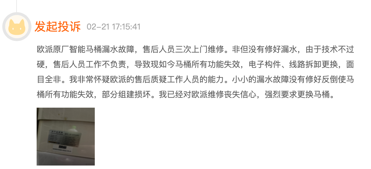 作为非主营业务,欧派家居在智能马桶的维修上就被消费者投诉“不专业”。