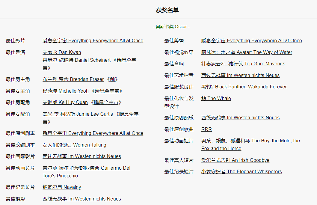 此外《西线无战事》获得包括最佳国际影片、最佳配乐、最佳摄影、最佳艺术指导在内的四个奖项,是《瞬息全宇宙》之外的又一赢家;《鲸》则是闷声发大财,仅三项提名最终收获两项。