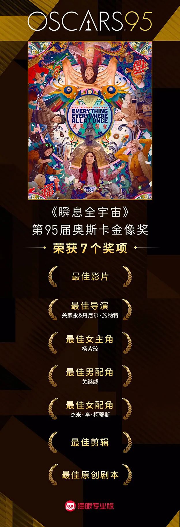 《瞬息全宇宙》拿下最佳影片、最佳导演、最佳女主角、最佳剪辑、最佳原创剧本、最佳男女配角等七项大奖,成为实至名归的最大赢家。这一成绩虽不及《宾虚》《泰坦尼克号》《指环王3》曾狂揽11项奥斯卡的历史盛况,但无论从题材风格还是演员角度来看,《瞬息全宇宙》都是历届最有“新意”的奥斯卡选择之一;