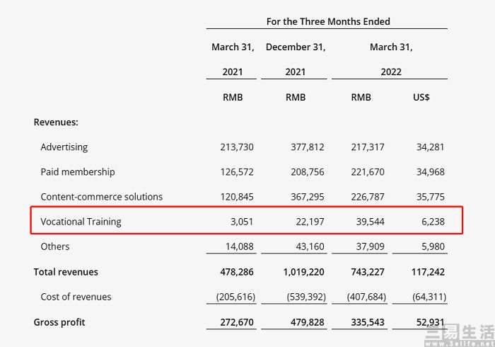 在整合了这些投资的平台后,2022年第一季度知乎也首次将职业教育作为单独业务板块在财报中呈现,而3900余万元的收入在总营收中占比约为5.3%,成为继广告收入、付费会员收入和商业化内容解决方案后,知乎的又一收入来源。但这一数据在2021年同期,则不足310万元。
