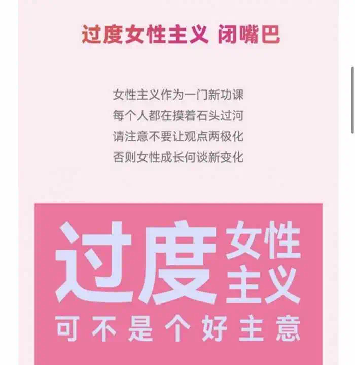 2022年,某电商三八节联合广告作品中出现了这样的广告文案,“为了统一高度,也不应该把男的腿弄短10cm——公平的方式,还有很多”,批评所谓的极端现象。今年,某运动品牌的三八营销也打出了“没事搞对立真是没纪律”,“过度女性主义 闭嘴巴”、“性别分子 闭嘴巴”等文案,激起众多抵制之声。