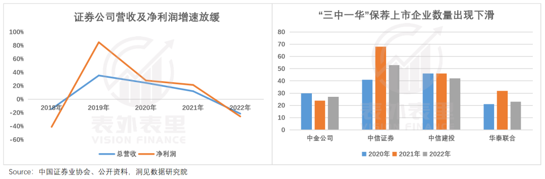 事实确实如此。中证协数据显示,近几年行业营入和净利润增速双双下滑,2022年更是负增长均超过20%。募资寒冬下,“三中一华”业绩也集体承压。
