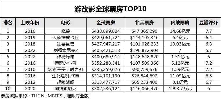 放眼整个世界影史,能够叫好又叫座的游改影屈指可数。在全球游改影票房前十名榜单上,有一半作品都来自至少七年之前。票房冠军至今被一部2016年上映的《魔兽》牢牢霸占。在这最卖座的十部影片里,豆瓣评分过7分的甚至不到一半。
