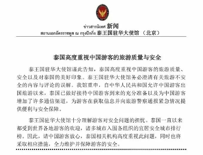 吓得泰国驻华大使馆不得不亲自下场辟谣,反复强调高度重视中国旅游质量与安全,言语中透出满满的求生欲,随即国内官方媒体也相继转发。