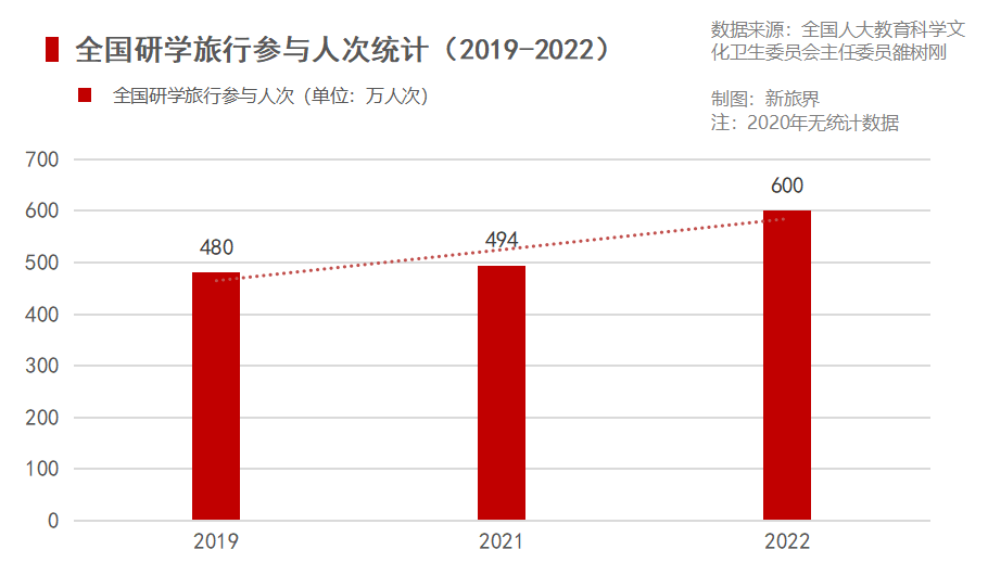 近10年,随着国家级政策支持研学旅行,义务教育“双减”背景,叠加新一代父母教育理念革新,催生研学旅行市场逆势增长:2021年研学旅行人数达494万人次,超过疫情前2019年的480万人次,2022年更是突破600万人次,创历史新高。
