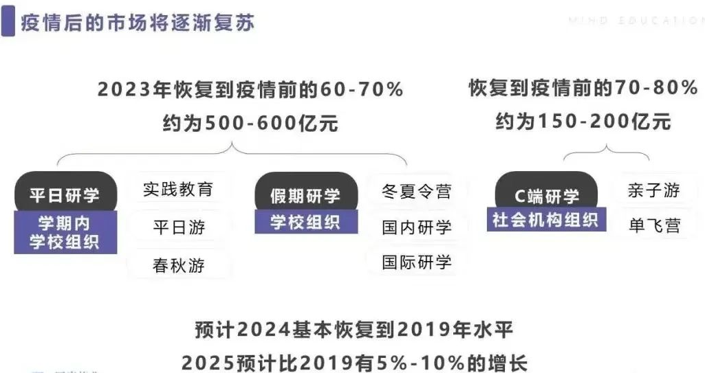 对此,世纪明德相关负责人表示,预计2023年学校组织的研学市场能恢复到疫情前60%-70%,约为500-600亿元。C端教培社会机构市场能恢复到疫情前的70-80%,约为150-200亿元。预计2024年,基本能恢复到2019年水平,2025年预计将比2019年有5%-10%的增长。