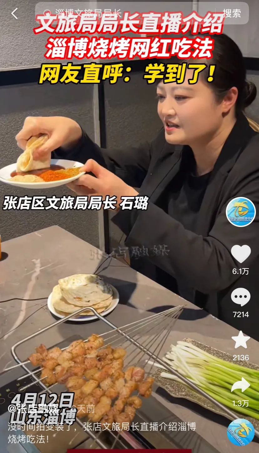 同时,淄博电视台、淄博张店区文旅局局长也利用直播的形式在抖音全民拥抱起各类热梗,“淄博烧烤”正确吃法展示、“坐上高铁去鲁C”、和现场食客们一起烤串唱歌等内容纷纷出现,官方代表的下场不仅拉近了用户的距离,也更代表了官方的鼓励态度,让这场传播之火燃得更旺。