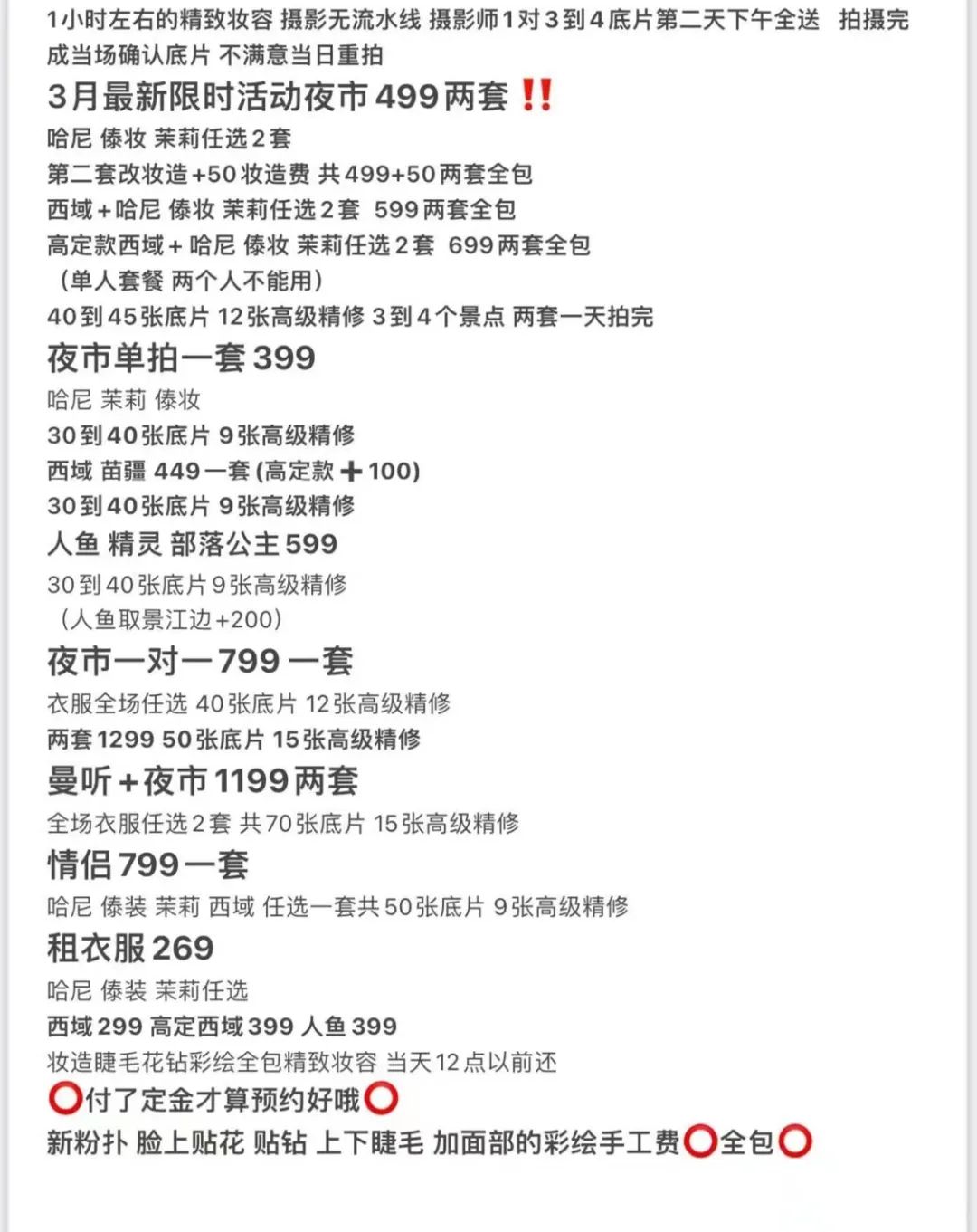 但市场很快接受了这些网红店的策略,崔永晖说,这几家店自带流量,越来越多的女孩找到他店里来,想拍网红店在社交平台上晒出的同款,而且只租衣服,不化妆——她们选择去网红店化妆,排队等上几个小时,也要预约网红化妆师的时间,光是化妆就是299元。其中,一位名叫兔子的化妆师最被青睐,在抖音上,她有超过70万粉丝,平时会直播自己的化妆过程,或者教大家化妆,每次直播都有小一千人观看。这些都给延吉的本地化妆师带来冲击,“原来游客们就喜欢这个。”