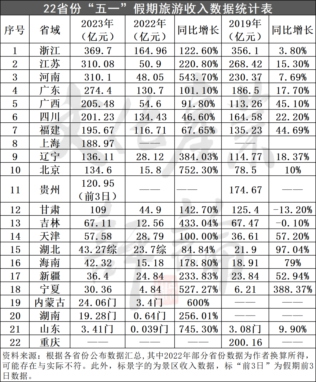 据文化产业评论(ID:whcypl)梳理盘点,在22个陆续公布了2023年“五一”假期文旅市场相关数据的省份中,假日旅游总收入突破100亿以上的多达12个,依次分别是浙江、江苏、河南、广东、广西、四川、福建、上海、辽宁、北京、贵州(为前3天数据)和甘肃。