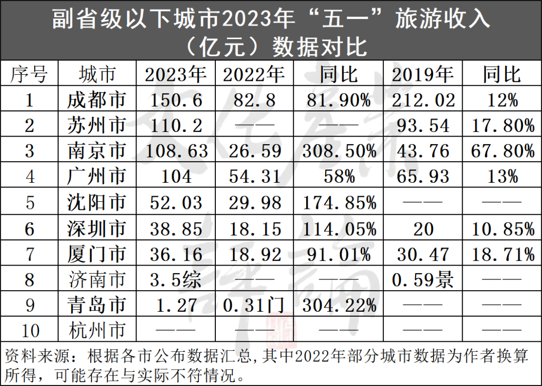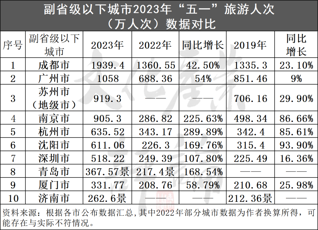 据中国旅游研究院专项监测显示,今年“五一”假期,副省级以下城市中,成都、广州、西安、武汉、深圳、杭州、长沙、郑州、南京和苏州等10城接待游客人数占全国游客总人数的16.37%,且多项指标提升明显。鉴于数据不齐,以下分析以可见公布数据为准。