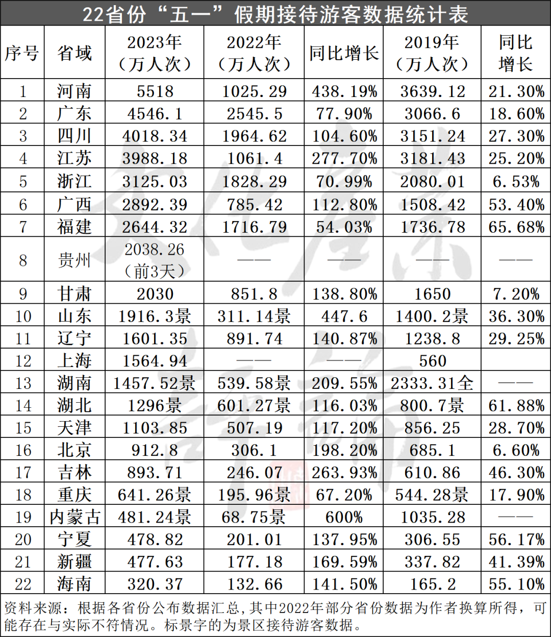 截至5月4日17时,全国已有22个省份陆续公布2023年“五一”假期文旅市场相关数据。以省域公布的数据为对比尺度,全国重点旅游省份的接待游客数量已经回到2019年同期水平。其中,河南、广东、四川、江苏、浙江、山东等省份增长态势较为强劲,创近年历史新高。