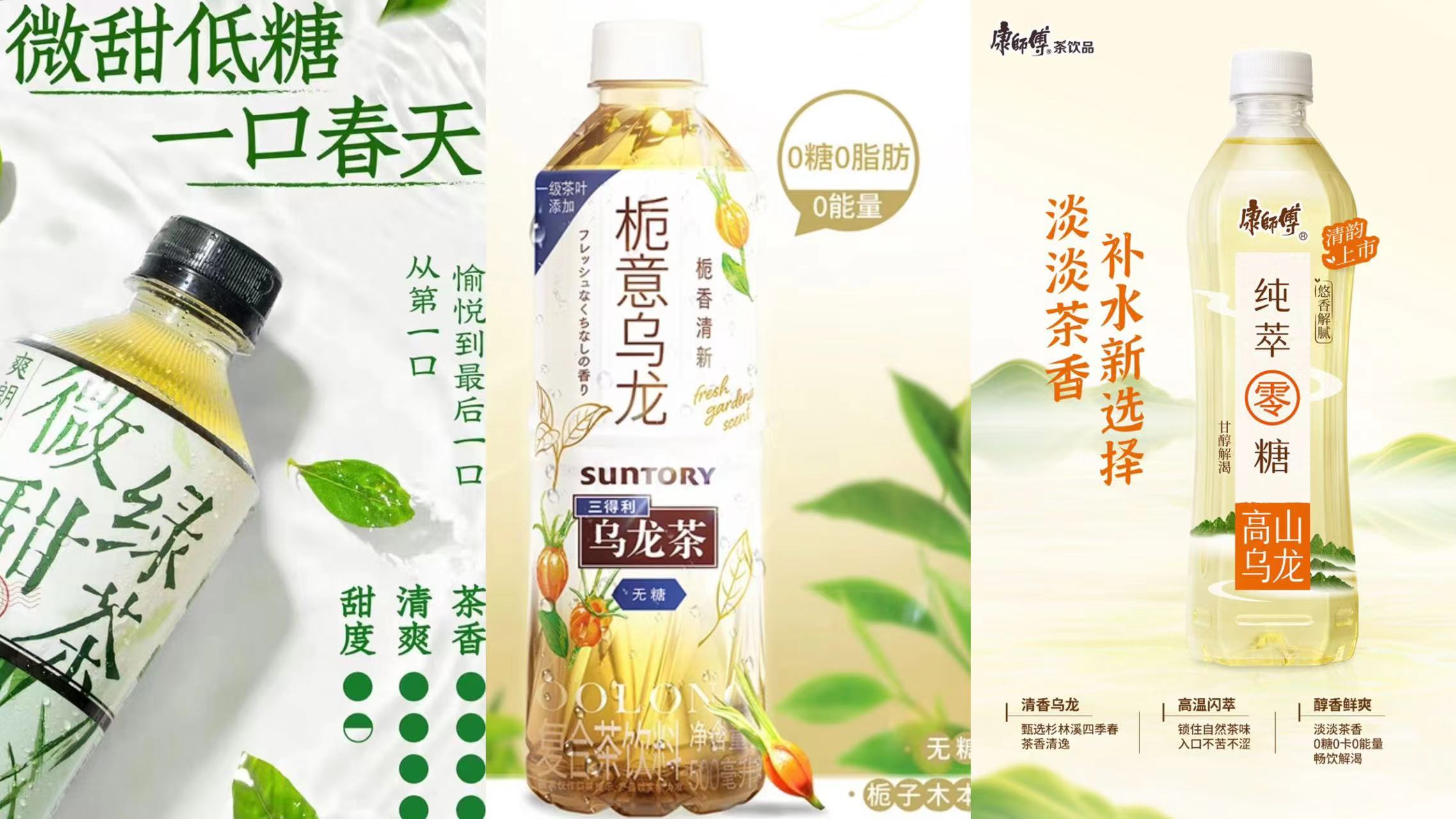 顺应这一趋势的还有元气森林的新品微甜绿茶、三得利乌龙茶系列的新品栀意乌龙、统一无糖茉莉绿茶等新品。其中,元气森林微甜绿茶主打“低糖、还原现泡绿茶”,含糖量为2.9克/100毫升。三得利栀意乌龙则主打0糖0脂,加上清新的设计让这两款产品在便利店的货架上拥有较好的位置。