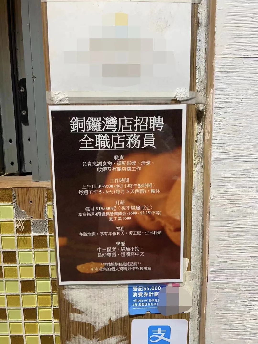 在灯光璀璨的铜锣湾走上一圈,几乎每家店铺门口都贴着招工启事,赵鹿看到普通服务员的薪资都是一万五千元港币起步,专业销售员则能达到两三万元,同时还拥有轮休、年假、劳工假等福利,相比于东莞服务员四五千元的月薪,和短缺的休息日,这里的待遇显得极具诱惑力。