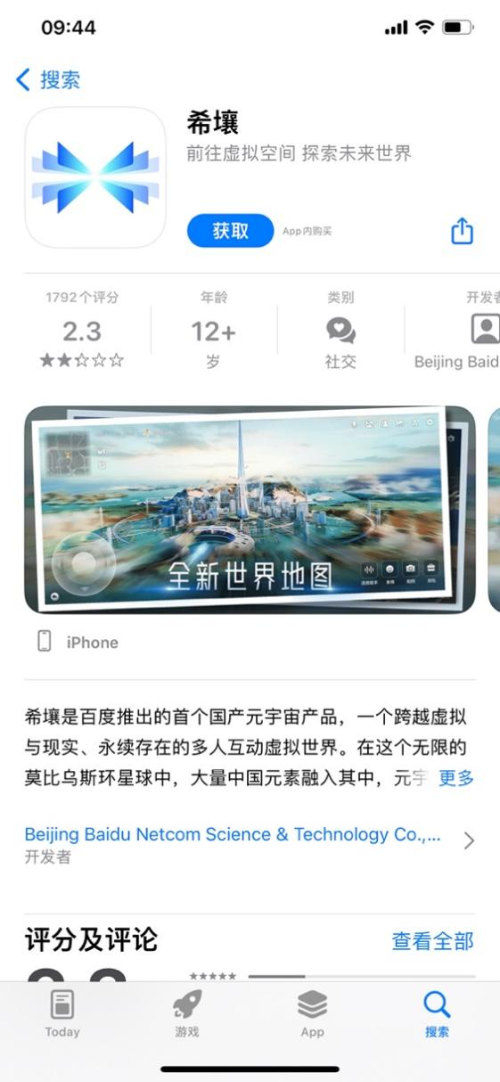 数据显示,在社交类APP中,希壤在各大应用商店的下载量排名靠后。苹果App Store中,希壤的评分仅有2.3,甚至被吐槽:“十年前的游戏建模都比希壤强,魔兽世界秒杀希壤……”