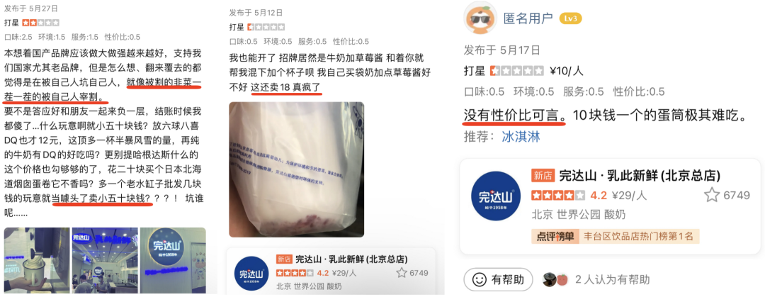 用户反馈挑明了真实的消费现状,在“乳此新鲜”北京首店的大众点评下,也有不少消费者直言性价比太低,“想着支持国产品牌却被割韭菜”“毫无性价比可言”。