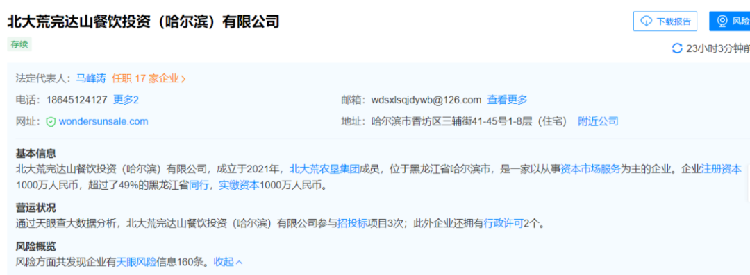 天眼查信息显示,“乳此新鲜”奶茶店由北大荒完达山餐饮投资(哈尔滨)有限公司授权,该公司成立于2021年,在哈尔滨含有17个分店机构。